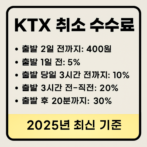 2025년 최신 기준으로 ktx 취소 수수료를 한눈에 정리합니다. ktx 예매 취소 시점별 위약금, 주말·공휴일·명절 특별 규정, 모바일 환불 방법과 사례 계산까지 정확한 정보를 제공합니다.